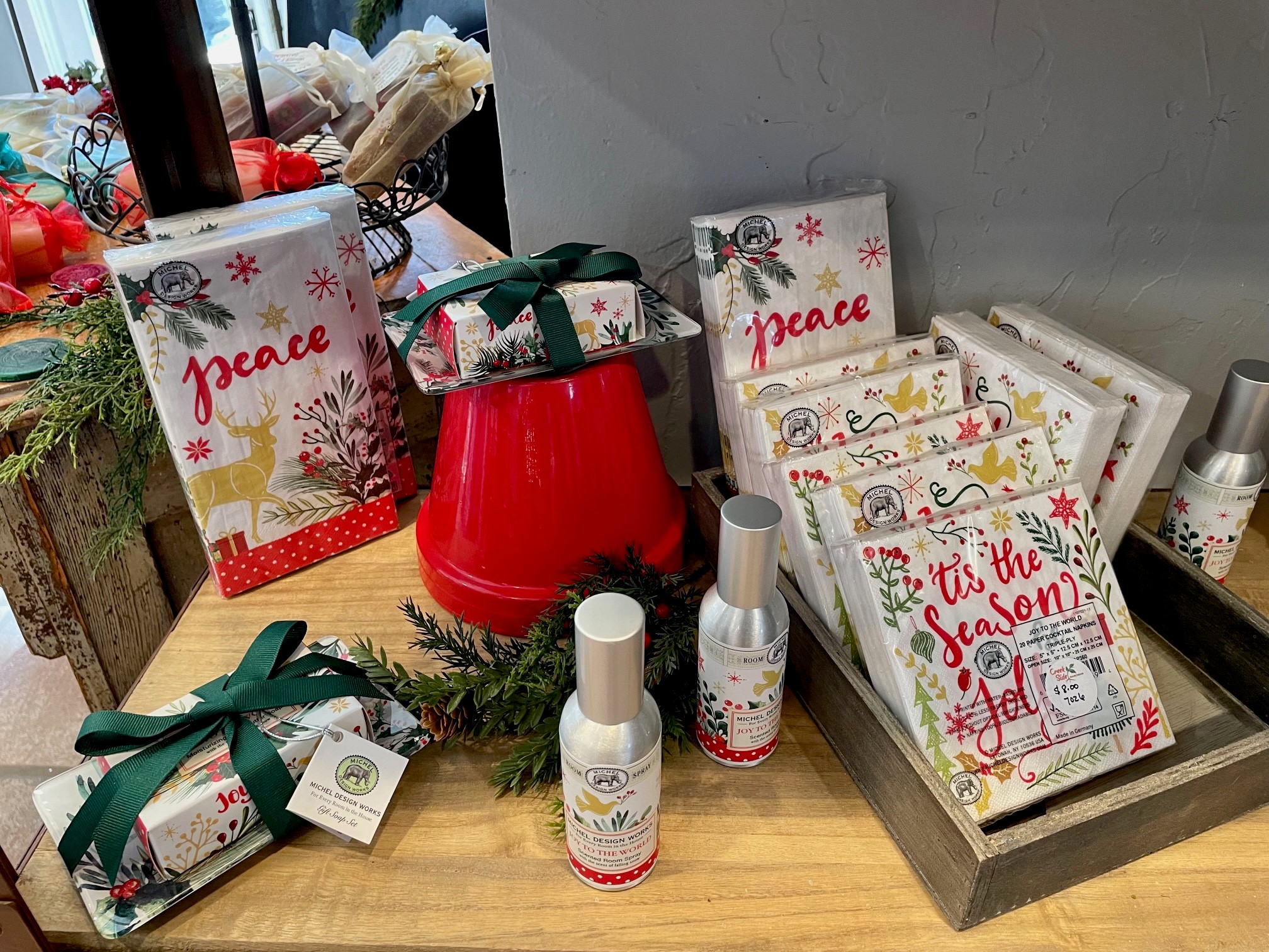 The foaming hand soap is a customer favorite. Great for a guest bathroom or kitchen sink. Decorative and perfectly scented soaps and room sprays are another great addition to a hostess’s bathroom. Compliment your choice with matching cocktail napkins or tissues.
